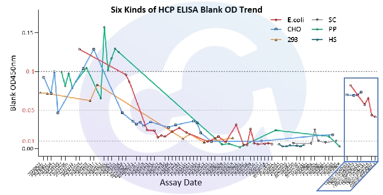 蓝色框为Cygnus F550-1多个独立时间和人员的检测本底水平,多数集中在OD 0.05-0.09以内。其余ELISA本底数据均为Cellgene原始数据整理。可以看出Cellgene HCP ELISA本底从0.1水平(2022年),到0.05水平(2024年),再降到0.01水平(2025年)。通常,内控可达0.004-0.009。充分代表了赛唐生物ELISA的技术体系不断进化,且将在药物质量安全细分领域持续深耕发力。见图2。