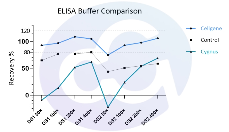 Cellgene从样本中筛选的极端的缓冲体系药物进行了梯度稀释,使用Cellgene开发的HCP ELISA buffer(CH-DIL1),进行ELISA的回收率比较。可以看到回收率可以控制在100±20%以内(实际质控范围为100±30%)。所以,本体系将会适应更多的药物类型和药物保存缓冲体系。为药物工艺开发的HCP定量,提供更为可靠的数据信息。见图3。