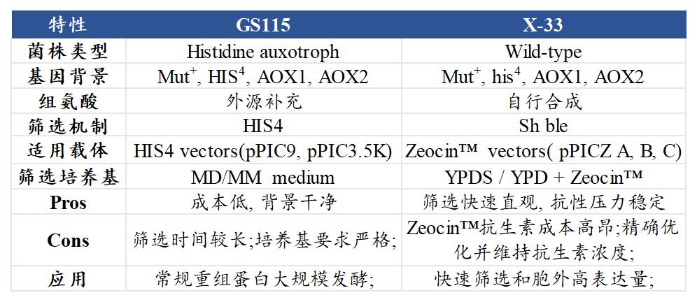 所有的毕赤酵母,最初都是来源于Northern Regional Research Laboratories, (NRRL; Peoria, IL)的Y-11430野生种系。而X-33是Invitrogen的野生品系,HIS4 基因编码一种多功能酶(磷酸核糖-AMP环化水解酶、磷酸核糖-咪唑甘油磷酸脱水酶、组氨醇脱氢酶),催化组氨酸生物合成途径中的三个关键步骤。经过HIS4突变后,菌株没有了功能性的 HIS4 基因,酵母就无法自行合成组氨酸。即组氨酸影响缺陷型菌株品系,形成了GS115品系[8,9]。