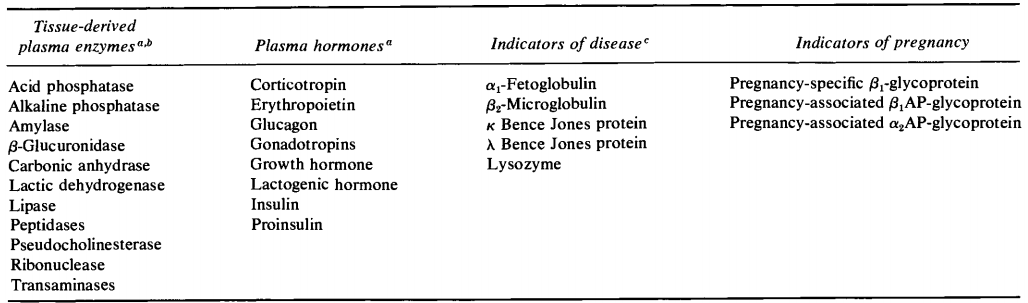 根据电泳技术的进步,后续Svensson和Longsworth[1,2]继续将血浆球蛋白蛋白分为α1,α2, β1,β2,γ1,γ2。在1973年,Laurell根据琼脂糖电泳,进一步将血浆蛋白分为13种主要蛋白,白蛋白,脂蛋白,抗胰蛋白,转铁蛋白,三种补体蛋白,纤维蛋白原,α1-酸性糖蛋白,珠蛋白,IgG,IgA,IgM球蛋白[3,4,5]。血浆中的蛋白来源,同样包含组织分泌的酶蛋白类,如酸性/碱性磷酸酶,淀粉酶,肽酶和核糖核酸酶等[6],见下表1: