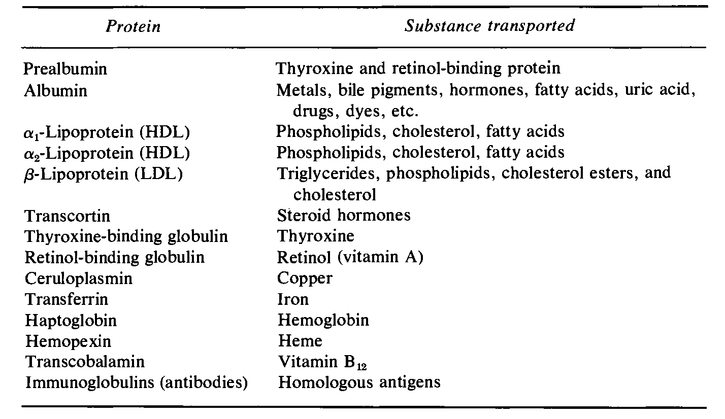 血浆中的转运蛋白,包含多种,且能够分别转运不同的底物,如白蛋白(Metals, bile pigments, hormones, fatty acids, uric acid, drugs, dyes,游离乙酰胆碱等),α脂蛋白(Phospholipids, cholesterol, fatty acids),Retinol-binding globulin(Retinol (vitamin A)),Immunoglobulins(Homologous antigens),参考下表3: